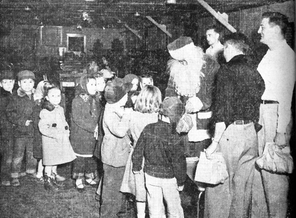 Santa Claus is coming to town. The Igloo "Vets" Club announced today that Santa Claus will make his annual visit to the Vets Club on Tuesday 21 December 1954. He will be on hand to greet the pre-school children at 1:15 and he is expecting a good sized gathering from these youngsters. Kindergarten children and children in grades one through four will be greeted by Santa the same afternoon, and he is busy making arrangements with the teachers of those respective grades for the time when they are to come to the club. So just don't forget kiddies that Santa will be around to see you and give each of you one of his "goody" treats next Tuesday at the Vets Club.
